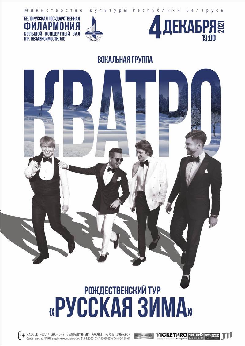 4 декабря в Минске состоится большой Рождественский концерт «Русская зима» вокальной группы «Кватро». В оригинальном и классическом прочтении прозвучат хиты, без которых немыслим Новый год в нашей стране: «Звенит январская вьюга», «Три белых коня», «Синий иней», «Снег кружится» и многие другие популярные композиции. Артисты продолжат традицию новогодних альбомов Фрэнка Синатры, Боба Дилана, Майкла Бубле и Кенни Джи, исполнив самые любимые новогодние песни.